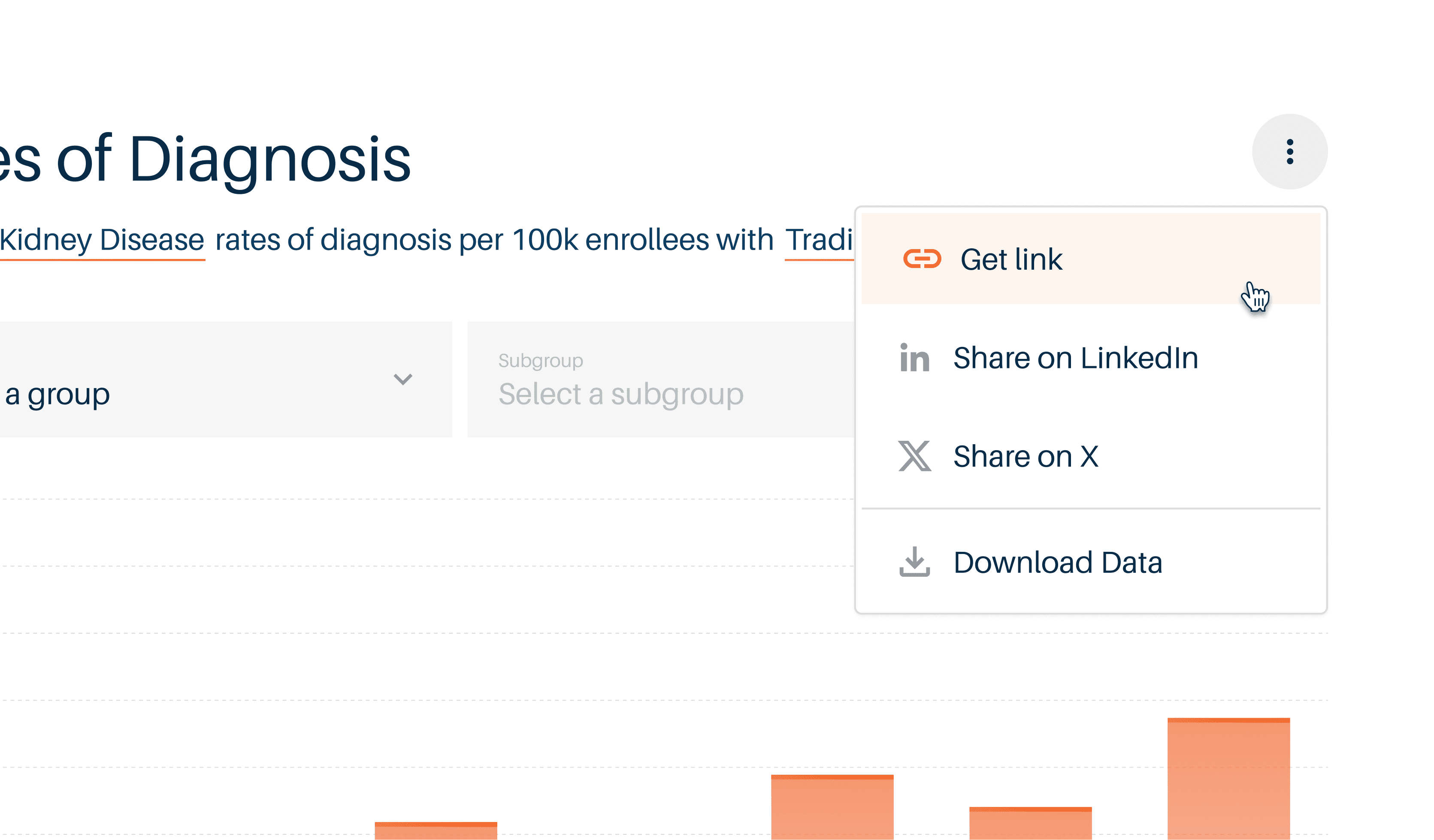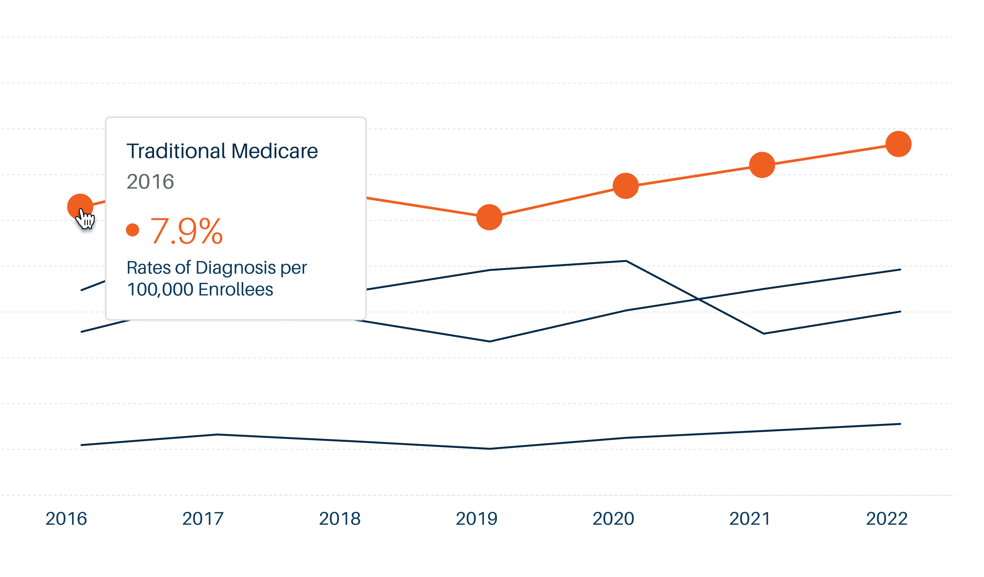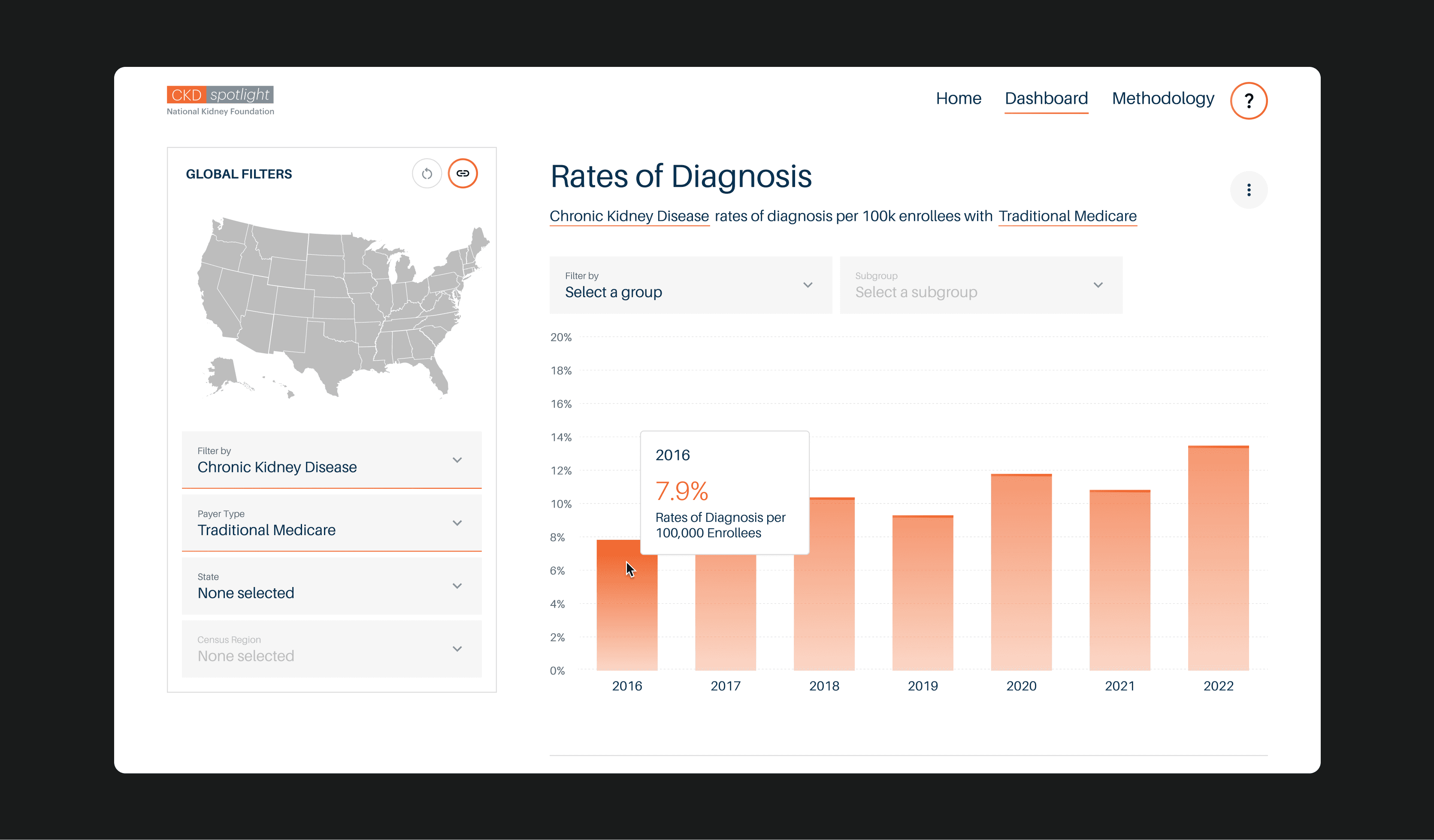 Health policy advocates struggle to find data for their region (quickly) and (reliably). Our dashboard makes it easy to filter, share, and investigate data by (geography, payer type, or disease).